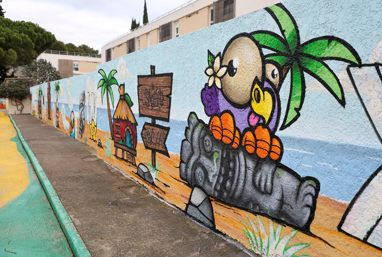 Projet artistique collaboratif lancé par la Ville, une fresque est actuellement en cours de finition à l’école maternelle Oswald. Cette œuvre associe création visuelle et démarche éducative, en mobilisant l’équipe pédagogique et les enfants autour d’une expérience artistique. Réalisée avec l'aide des deux artistes, Arnaud et Mica, sur le grand mur de la cour, cette fresque prend la forme d'un dessin géant mêlant alphabet, tikis, pioupioux et éléments de végétation, créant un univers à la fois ludique, joyeux et poétique.