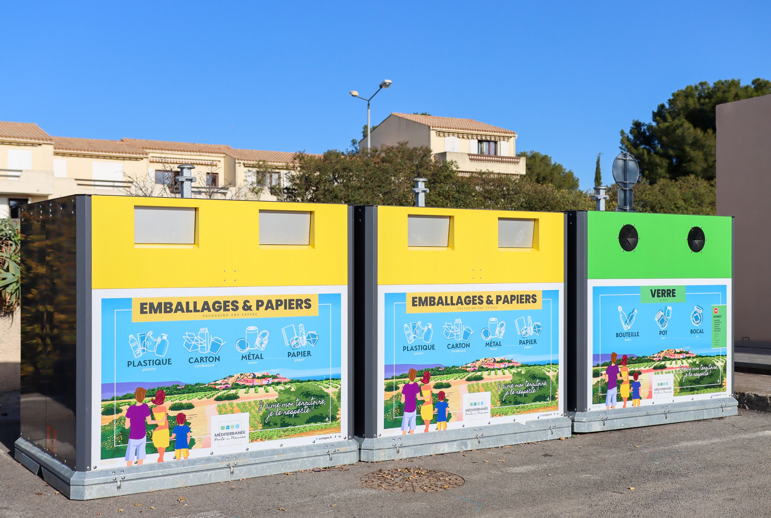 La verte (pour le verre) et la jaune, destinée à vos emballages (cartons, plastiques, métal, pots de yaourts, films plastiques, barquettes, sachets...) mais aussi à vos papiers (magazines, journaux, papiers imprimantes, enveloppes kraft et à fenêtres plastiques).