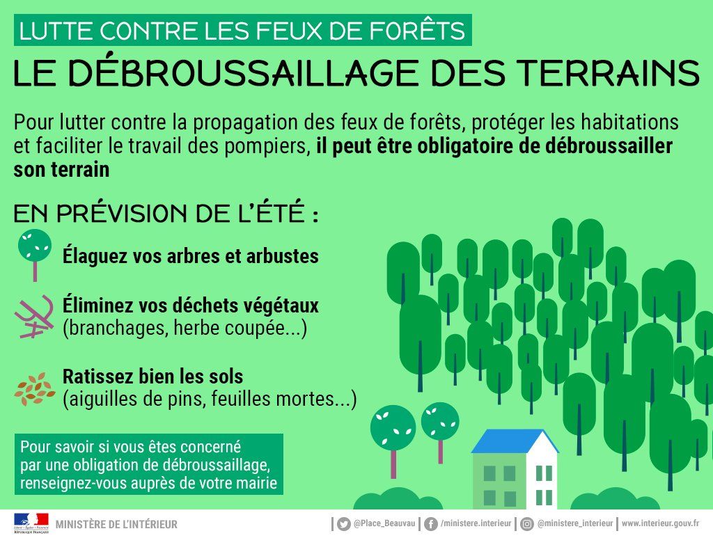 Il est nécessaire et obligatoire de débroussailler régulièrement car c'est un des meilleurs moyens de prévention contre les incendies de forêts. Le débroussaillement constitue ainsi une obligation légale pour tous les propriétaires. Sont concernés par cette obligation les espaces tels que : bois, forêts, landes, maquis, garrigues, plantations et reboisement ainsi que la bande des 200 mètres autour de ces formations. Dans cette zone, vous devez débroussailler à 50 mètres autour des constructions et sur 10 mètres autour des voies privées y donnant accès y compris si ces travaux doivent s’étendre au-delà des limites de votre terrain. Ces obligations s’étendent également à la totalité des terrains concernés par le Plan de Prévention des Risques Incendies de Forêt (PPRIF).
