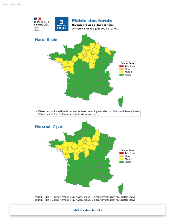 Attention : la Météo des forêts n’informe pas sur les incendies en cours ou à venir. De plus, un niveau de danger faible ne signifie pas l’absence de risque d’incendie sur le département.