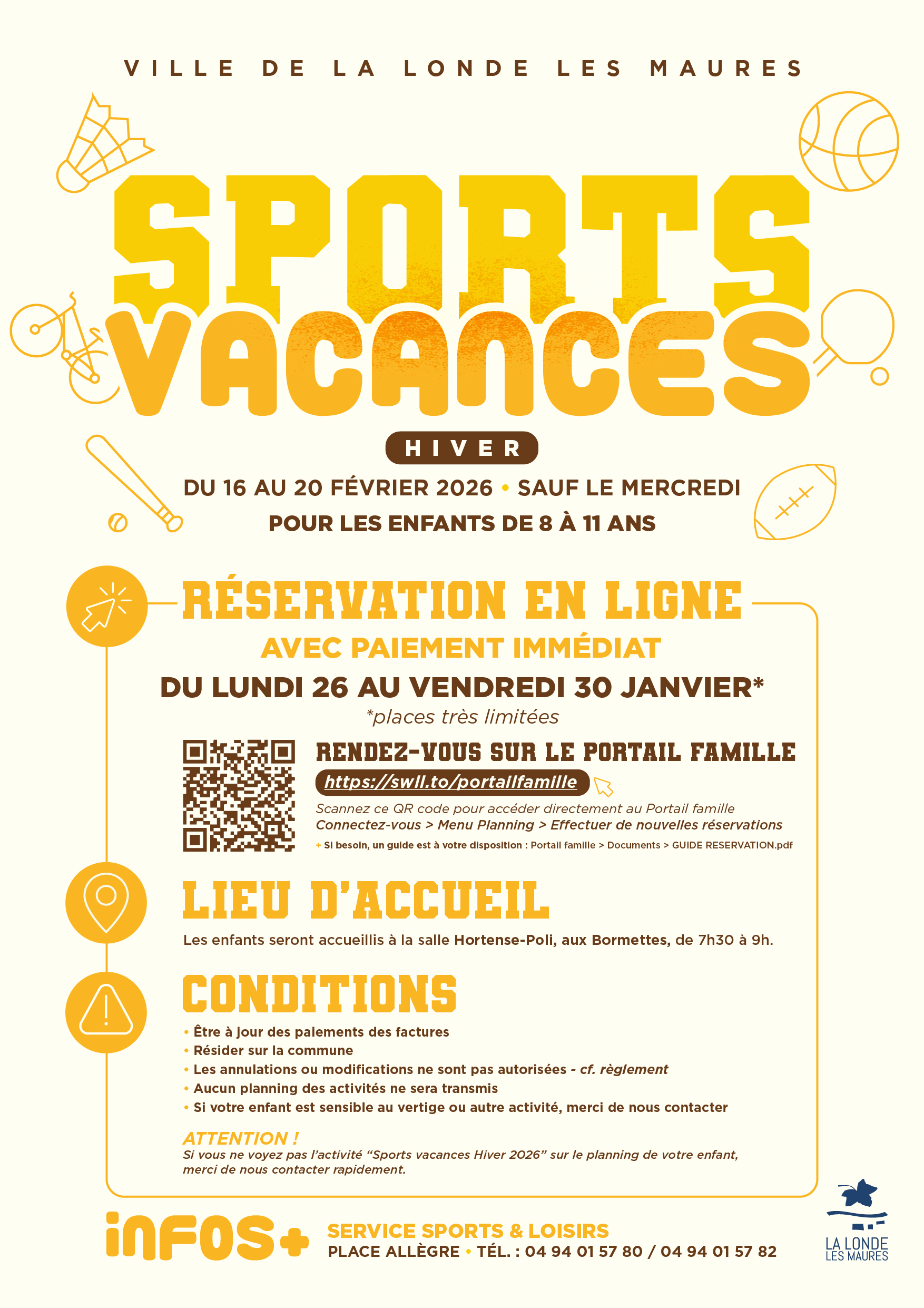 À l'occasion des vacances d'hiver 2026, des journées Sports Vacances sont proposés pour les enfants de 8/11 ans. Les enfants seront accueillis à la salle Hortense-Poli aux Bormettes, de 7h30 à 9h.