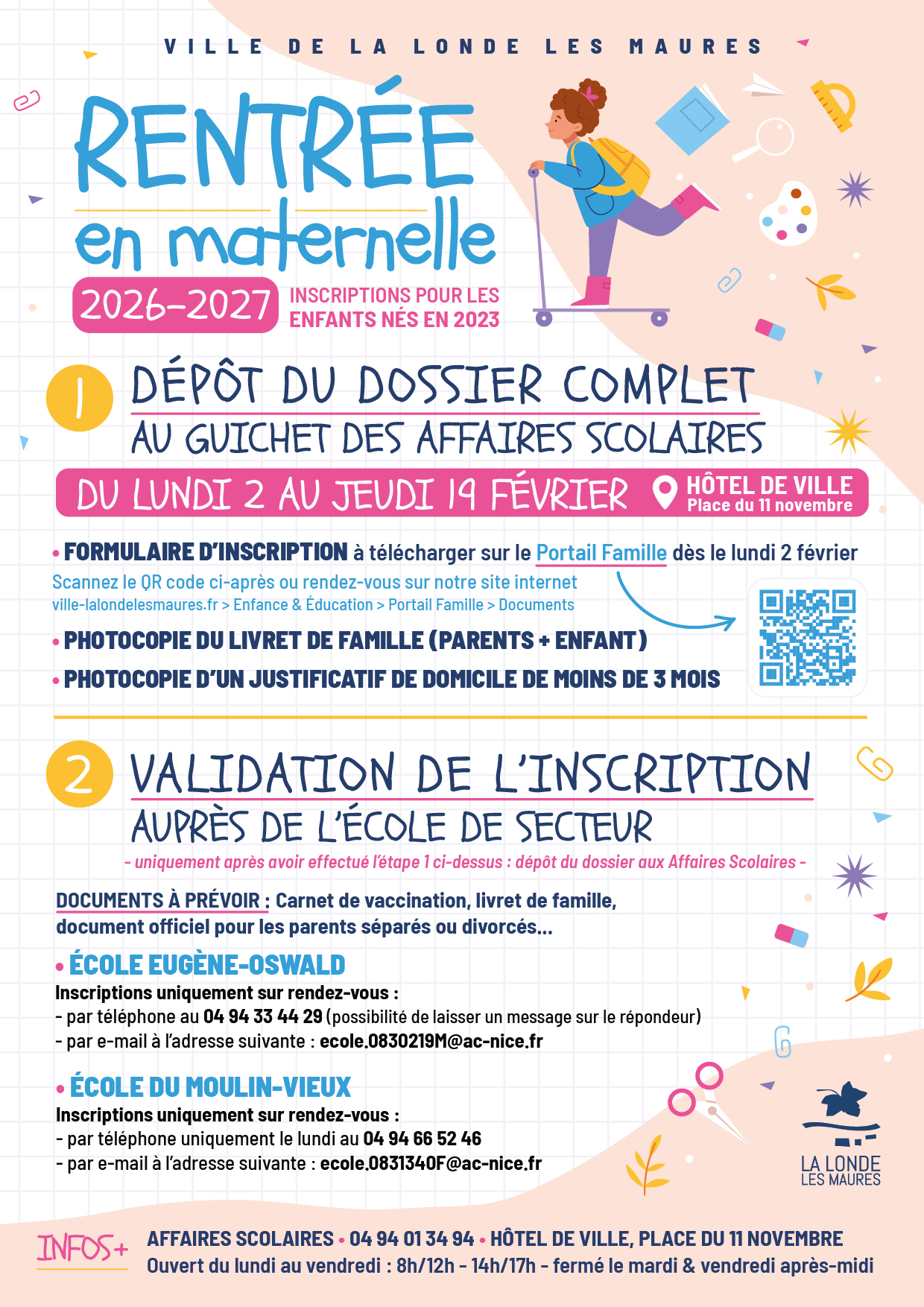 Les inscriptions sont encore possibles pour les retardataires, notamment les familles qui viennent tout juste d'arriver à La Londe, en vue de l'année scolaire 2025/2026, pour l'inscription scolaire, la restauration scolaire et l'accueil périscolaire.